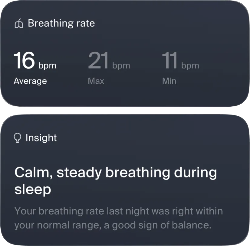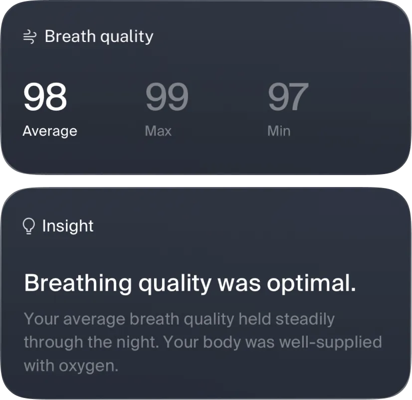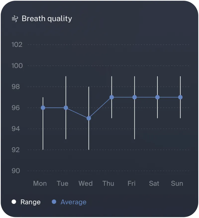 Velia tracks your breathing quality quietly, day and night, revealing subtle shifts that reflect your stress, recovery, and overall health. These gentle insights help you tune into your body’s natural rhythms, supporting a sense of calm and balance, never demanding your constant attention.