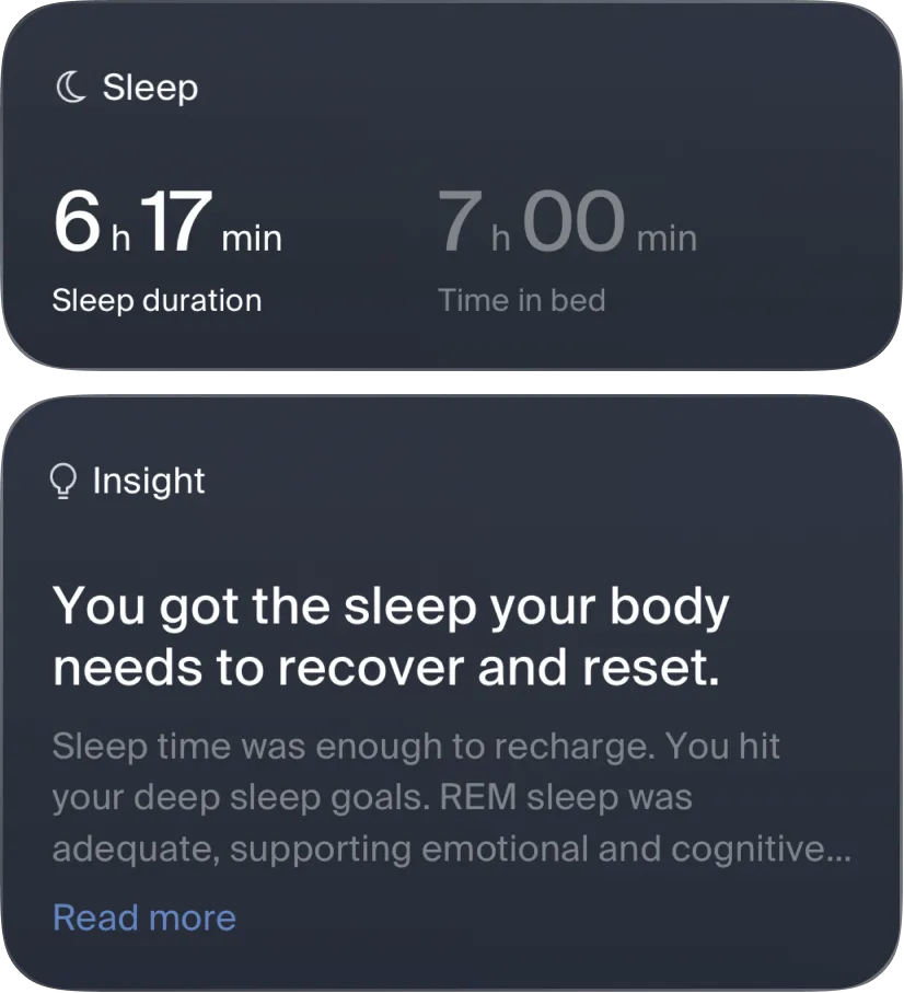 Velia brings you gentle, science-backed insights into every stage of your sleep, light, deep, and REM, so you can see how rest supports your long-term clarity, mood, and resilience. No judgment, just the knowledge you need to make choices today that build a vibrant tomorrow.