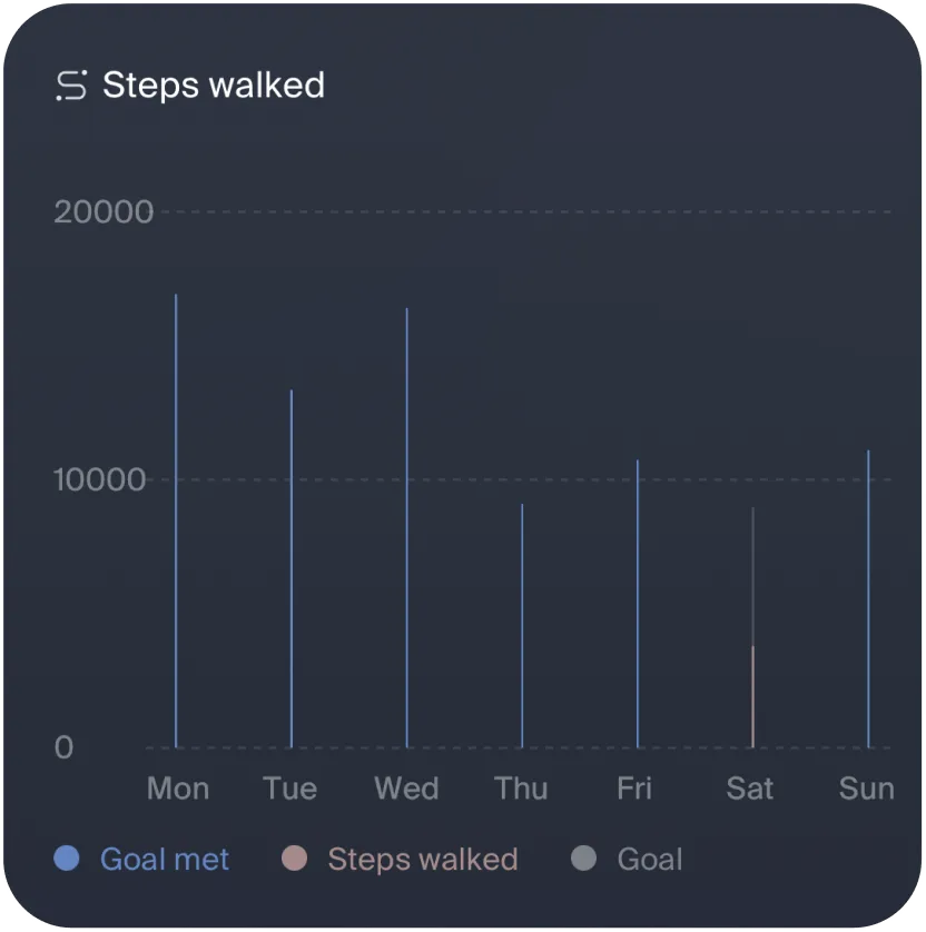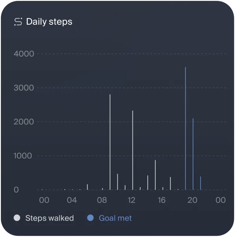 Velia tracks your steps and activity quietly in the background, making it easy to set gentle goals. Every step is a quiet investment in heart health, mood, and vitality, helping you build habits for a healthier, happier future, at your own rhythm.