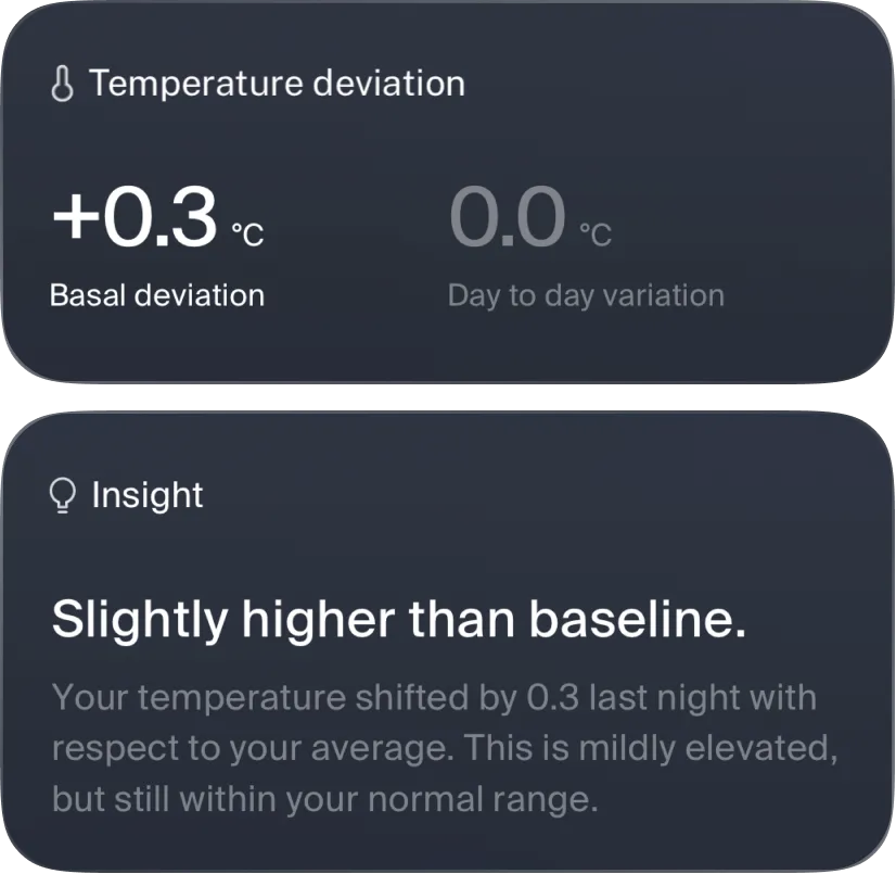 Velia measures your skin temperature each night, quietly revealing how your body is recovering and adapting. Early, science-based insights help you notice small changes, so you can make proactive, informed decisions for your long-term well-being.